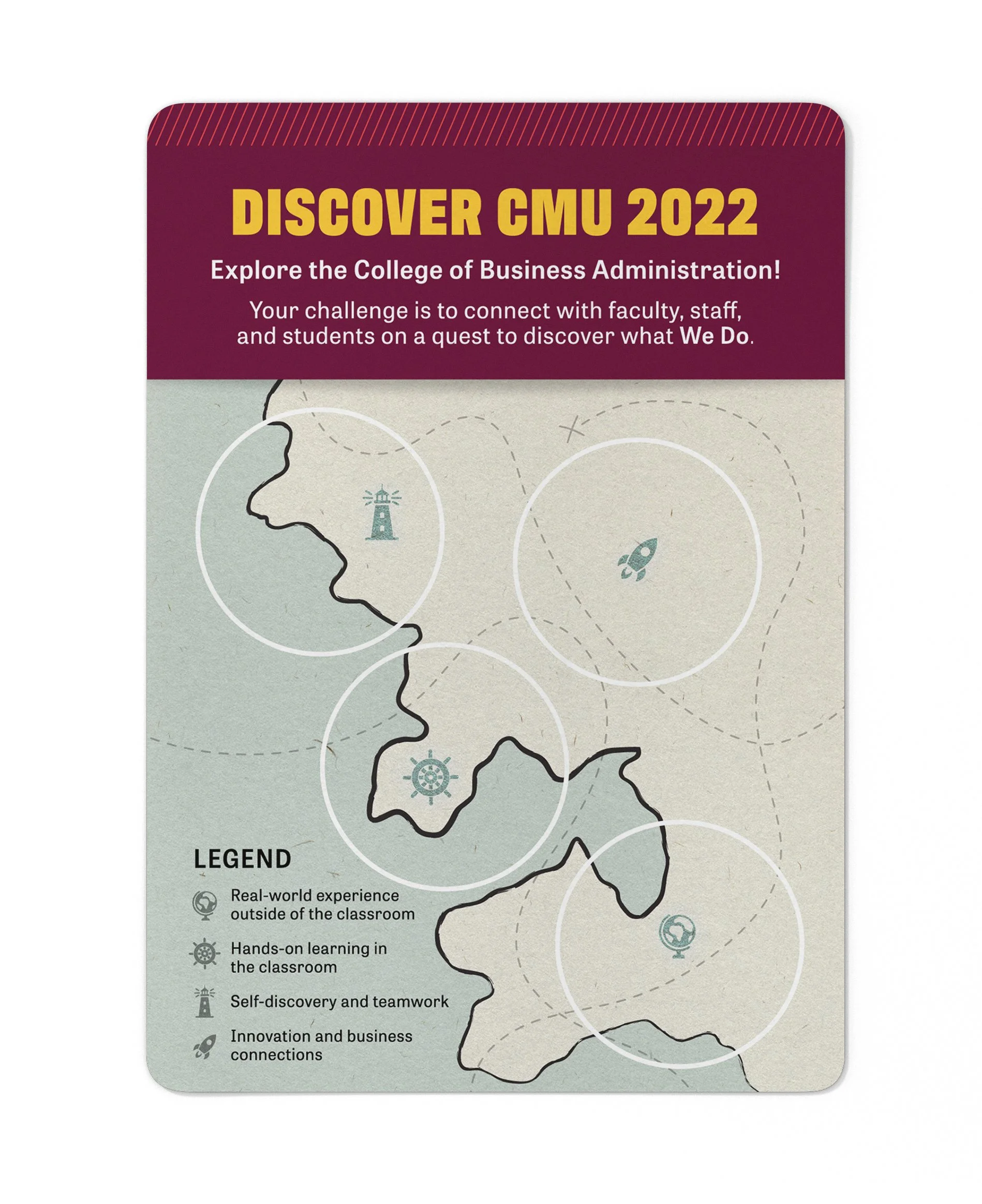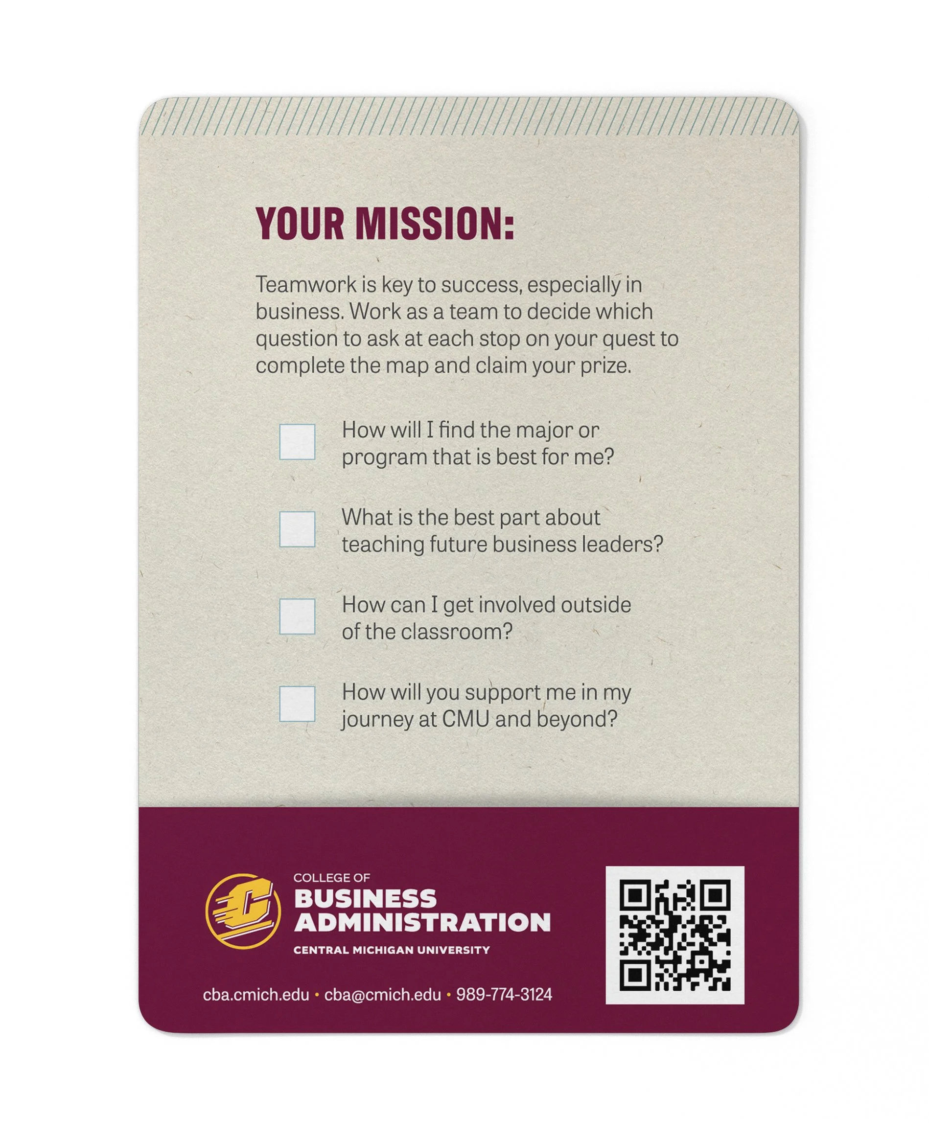 The College of Business Administration wanted an active and unique experience different from the other colleges. I worked with the Office of Student Engagement and Professional Development to design a scavenger hunt throughout Grawn Hall. Upon arrival, the students would receive a quest card and split into groups. They would then be guided around the building to meet with professors, experience spaces, and participate in hands-on activities. At each of the four stops, the students would receive a sticker that visually represented the theme of the destination. They were also encouraged to ask one of the questions on the back of the cards. After compelling the quest and filling the card with stickers, the students received a prize of freshly made kettle corn.